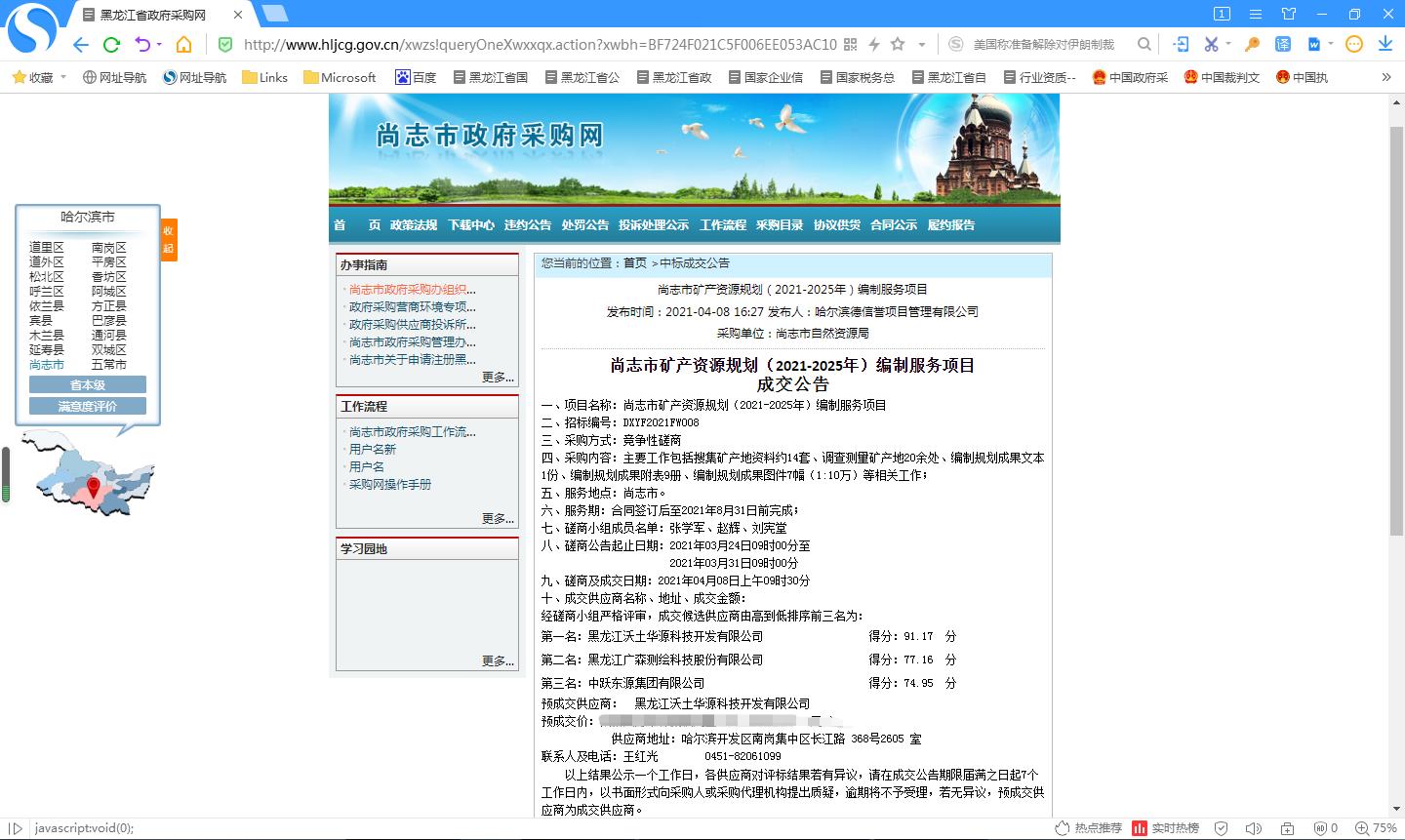 2021年04月08日 中标 尚志市矿产资源规划(2021-2025年)编制服务项目