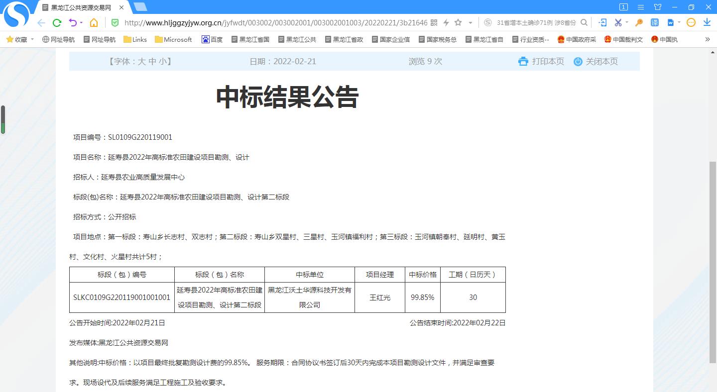2022年02月21日 中标 延寿县2022年高标准农田建设项目勘测、设计第二标段